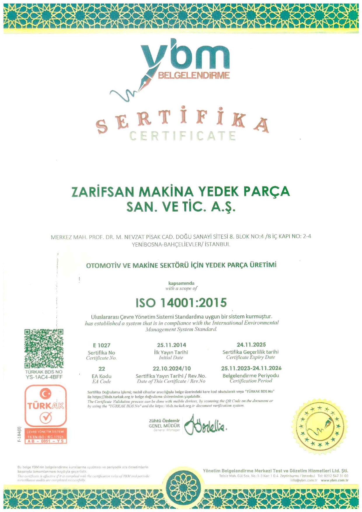 IATF 14001:2015 Onay Tarihi: 22.10.2024 Geçerlilik Süresi: 24.11.2025
